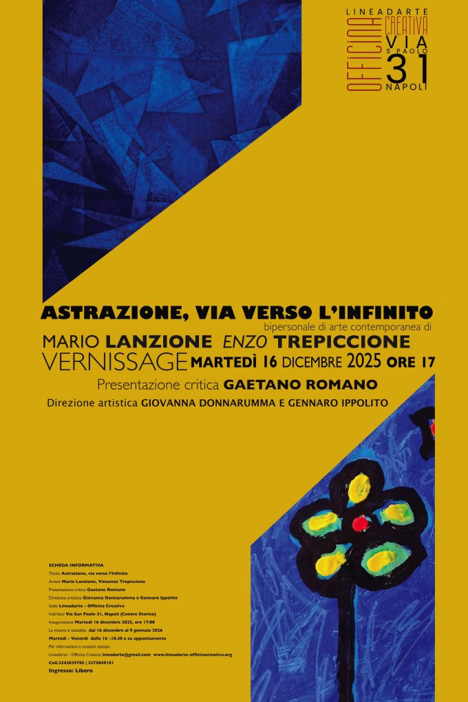 Astrazione, via verso l’Infinito: A Lineadarte Officina Creativa il dialogo pittorico tra Mario Lanzione e Vincenzo Trepiccione Martedì 16 dicembre…