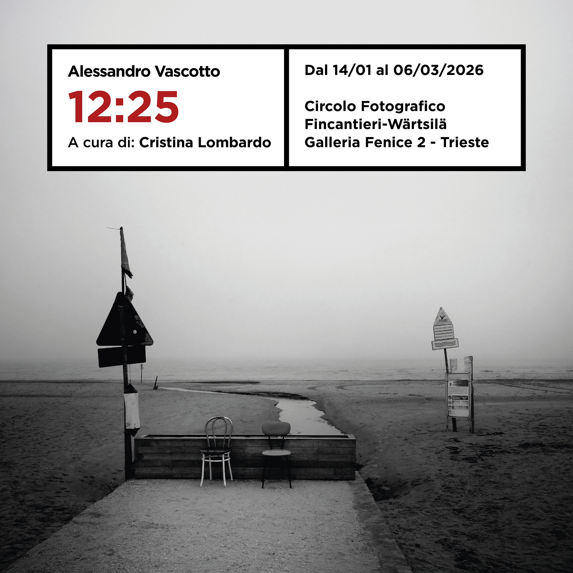 12:25 è una mostra fotografica di Alessandro Vascotto, curata da Cristina Lombardo e ospitata negli spazi del Circolo Fotografico Fincantieri Wärtsilä. Il titolo fa riferimento alla durata media del ciclo della marea, un tempo naturale e ricorrente che diventa chiave di lettura dell’intero progetto: un ritmo costante che governa il paesaggio e ne determina trasformazioni lente ma inesorabili.