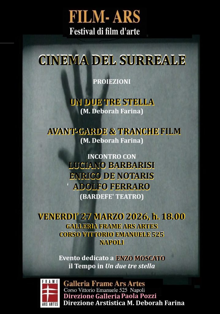 "Film-Ars. Festival d'arte" presenta un importante appuntamento della rassegna. "Il Cinema del Surreale", con la proiezione di "Un due tre stella" di M. Deborah Farina e l'incontro con Luciano Barbarisi, Enrico De Notaris, Adolfo Ferraro, protagonisti del film accanto a Enzo Moscato a cui l'evento è dedicato.