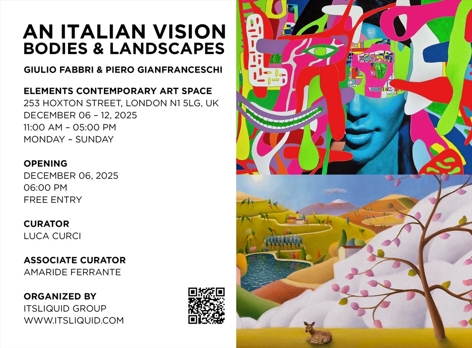 London (UK) December 06, 2025 - ITSLIQUID Group, in collaboration with YMX Arts, is pleased to present An Italian Vision – Bodies and Landscapes, a dual solo exhibition featuring Italian artists Giulio Fabbri and Piero Gianfranceschi, curated by Luca Curci and coordinated by Amaride Ferrante. The show will be held in London from December 06 to December 12, 2025, at ELEMENTS Art Space.