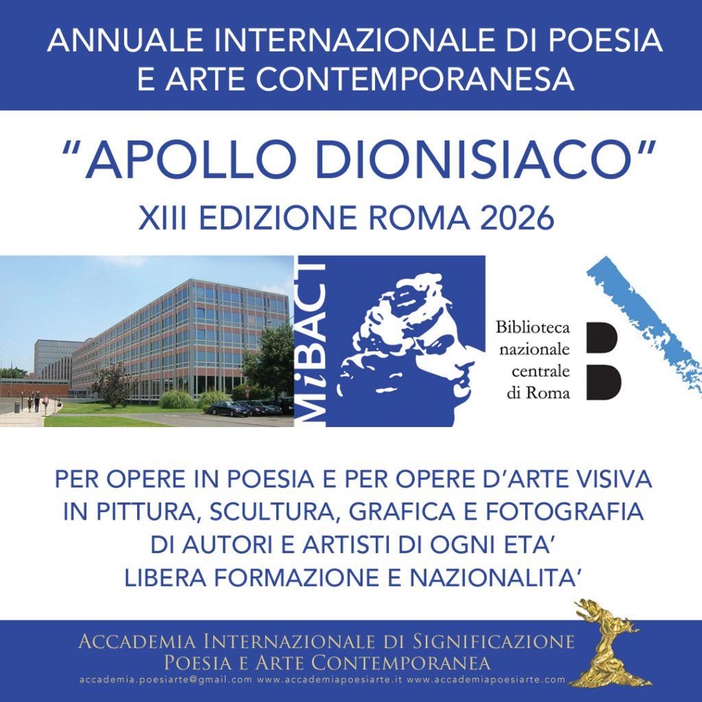 L’Accademia Internazionale di Significazione Poesia e Arte Contemporanea, polo no profit di significazione e di valorizzazione del linguaggio poetico e artistico, in convenzione formativa con l’Università degli Studi di Roma Tre, accreditata dalla Regione Lazio, iscritta all’albo di Roma Capitale e promossa dall’Istituto Italiano di Cultura di New York, bandisce il Premio Accademico Internazionale di Poesia e Arte Contemporanea Apollo dionisiaco, XIII Edizione Roma 2026, senza scopo di lucro.