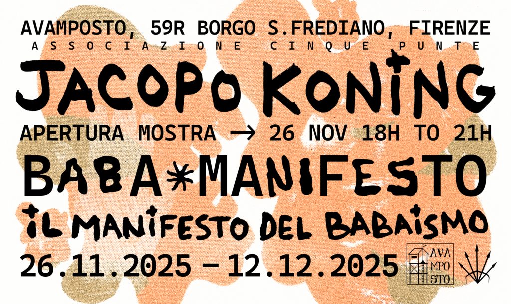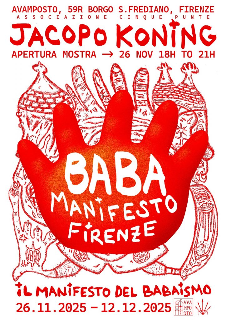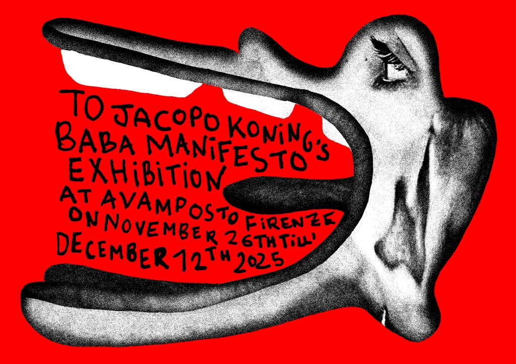 Avamposto presenta BABA MANIFESTO: Manifesto of Babaism, la prima mostra personale di Jacopo Koning a Firenze, a cura di Bianca Rafaelle, dal 26 novembre al 12 dicembre 2025 in Borgo San Frediano 59R.
