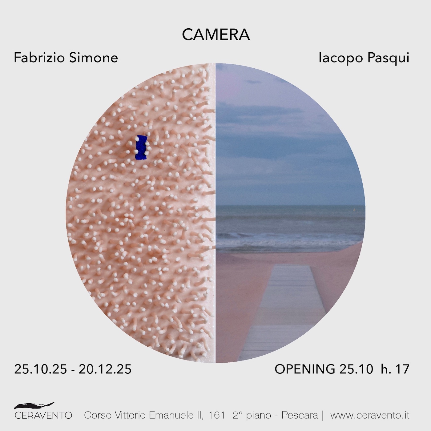 Un titolo che racchiude un doppio sguardo. "Camera" è al tempo stesso obiettivo e stanza: uno strumento che cattura ciò che sta fuori e uno spazio che accoglie ciò che si muove dentro. La nuova mostra ospitata dalla galleria Ceravento di Pescara, in programma dal 25 ottobre al 20 dicembre, mette in dialogo i lavori di Iacopo Pasqui e Fabrizio Simone, due artisti che, attraverso linguaggi diversi - il primo la fotografia, il secondo la scultura - condividono un approccio sensibile e una ricerca sulla percezione, sul tempo e sulla memoria.