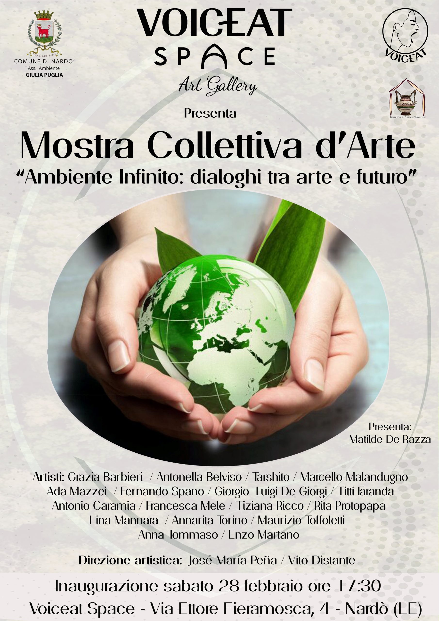 “Ambiente infinito: dialogo tra Arte e Futuro” è il titolo della Mostra (che gode del patrocinio dall’Assessorato all’Ambiente del Comune di Nardò – Assessore Giulia Puglia - e dell’ Istituto di Cultura Salentina) che sarà inaugurata sabato 28 febbraio alle 17.30 alla presenza di autorità locali, giornalisti e critici d’arte e sarà fruibile fino al 14 marzo.