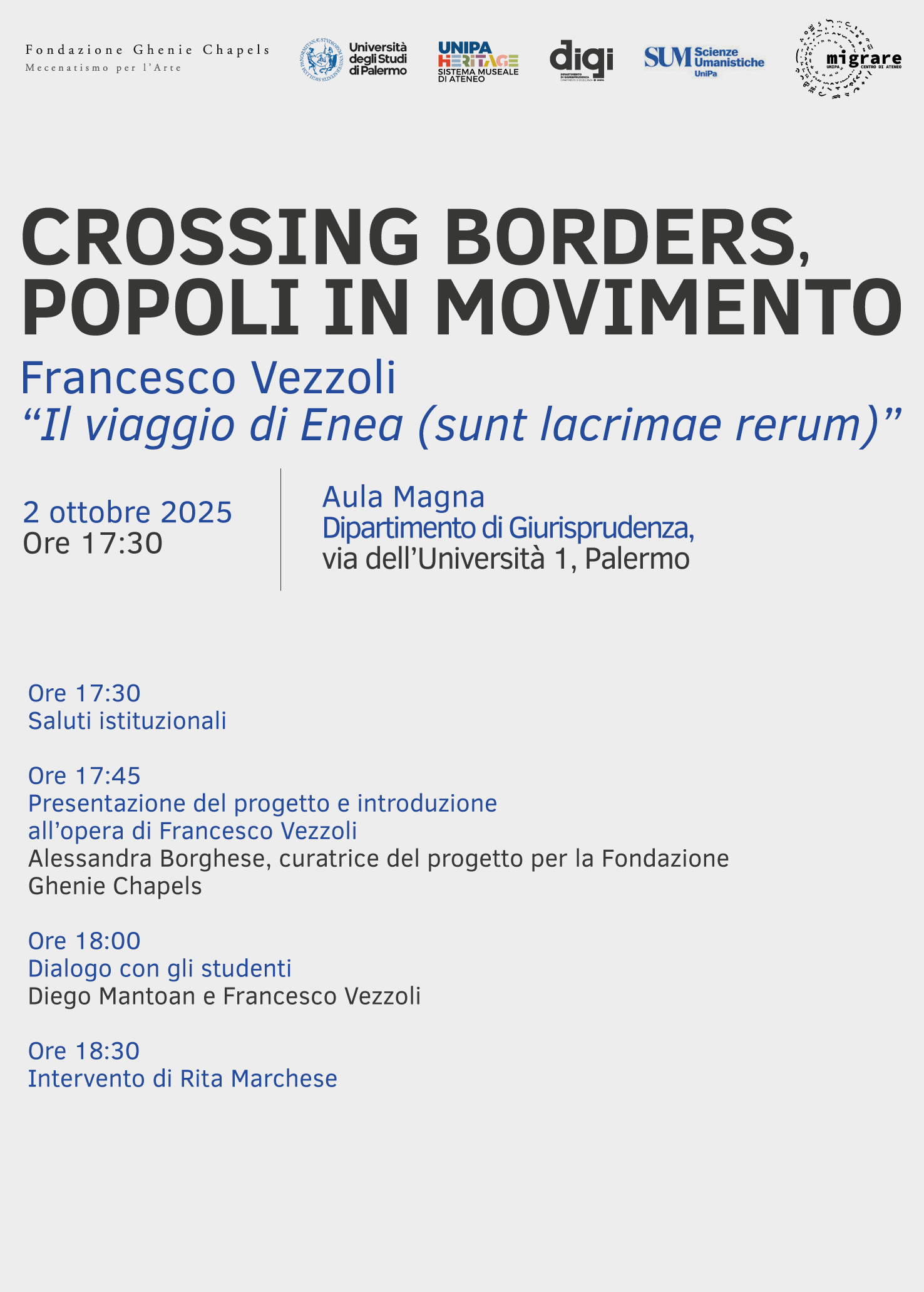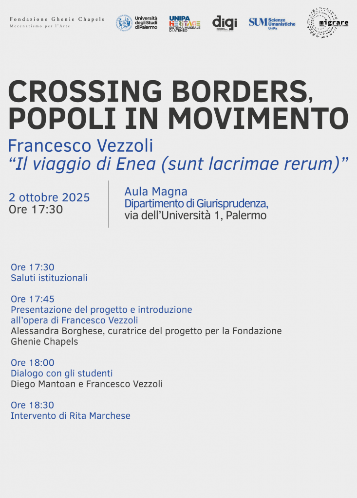 Crossing Borders, Popoli in Movimento Un progetto artistico e umanistico promosso dalla Fondazione Ghenie Chapels – Mecenatismo per l’Arte A cura di Alessandra Borghese, in collaborazione con l’Università degli Studi di Palermo Inaugurazione dell’opera di Francesco Vezzoli Il viaggio di Enea (sunt lacrimae rerum) 2 ottobre 2025 – ore 17:30 Aula Magna, Dipartimento di Giurisprudenza – Via dell’Università 1, Palermo