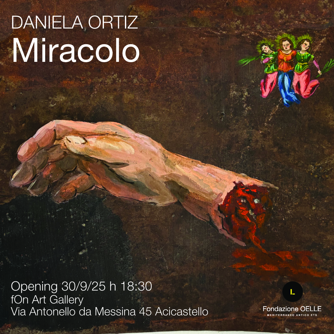 Alla Fondazione OELLE Mediterraneo Antico martedì 30 settembre alle ore 18.30 l’artista peruviana Daniela Ortiz presenta “Miracolo”, un potente racconto visivo sulla resistenza anticoloniale e la tragedia palestinese, sviluppato durante la sua residenza artistica in Sicilia in quanto vincitrice del Premio OELLE – Mediterraneo Antico 2024, assegnatole durante la scorsa edizione di Artissima. Ispirandosi alla tradizione degli ex voto del Santuario dei Santi Martiri Alfio, Filadelfo e Cirino a Trecastagni, Ortiz crea un racconto visivo che attraversa la resistenza anticoloniale, l’antifascismo storico e la lotta palestinese. I suoi lavori riscrivono le narrazioni ufficiali, trasformando simboli di oppressione in strumenti di liberazione.