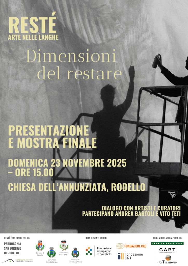 Resté è un progetto che valorizza il territorio delle Langhe attraverso l’arte contemporanea, creando un dialogo vivo tra paesaggi, patrimonio culturale e comunità. Promosso dalla Parrocchia di San Lorenzo di Rodello con Fondazione Santi Lorenzo e Teobaldo e UnTerritorio ETS, il progetto trasforma i luoghi in spazi condivisi di incontro e riflessione.