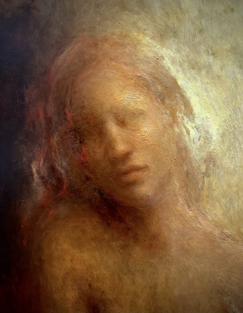 «Affiorare indica un’immagine che prende forma senza compiersi», spiega Erica Conti a proposito della mostra. «Nelle opere, l’immagine emerge lentamente dalla materia pittorica, come se il corpo fosse già presente e la pittura ne rivelasse solo alcune parti, lasciandone altre in sospensione. Le figure non si impongono allo sguardo: restano sulla soglia tra visibile e invisibile, tra memoria e forma. La pittura agisce per stratificazione, erosione, sottrazione: ciò che affiora non è mai completo, ma sufficiente a testimoniare una presenza. In questo senso, affiorare è un processo più che un risultato. La pittura diventa così un luogo di soglia, dove l’immagine non si compie, ma continua ad accadere». In questo processo, il corpo è inteso come luogo di passaggio e la traduzione di tale poetica avviene attraverso una tecnica che procede per stratificazione, cancellazione e ritorno, permettendo alla figura di manifestarsi sulla tela senza mai svelarsi del tutto.