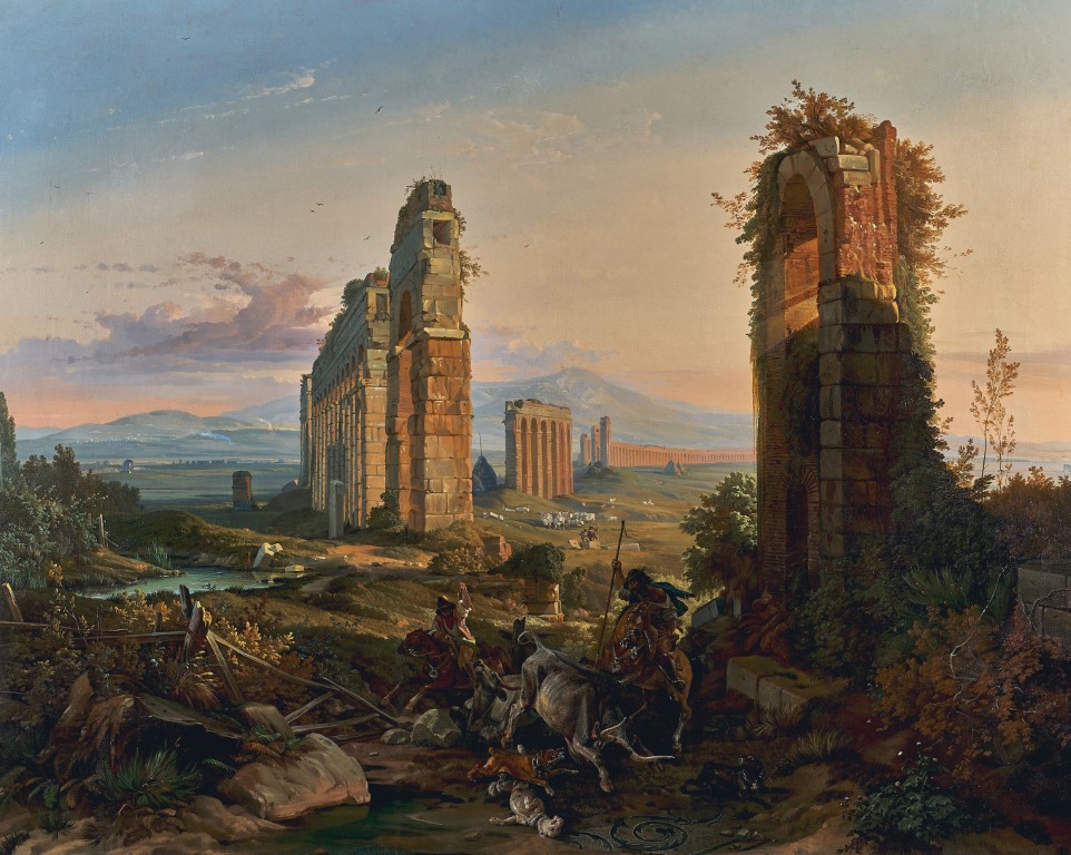Il soggetto era allora nuovo e spettacolare: le imponenti rovine dell'acquedotto alle porte di Roma. Solo dalla fine degli anni Venti del XIX secolo gli artisti cominciarono a interessarsi al monumento. Il dipinto di Nerly segna l'inizio di questa evoluzione ed è unico nel suo genere. Opere di Blechen, Piranesi, Schirmer, Spitzweg e altri illustrano la carriera del soggetto pittorico.