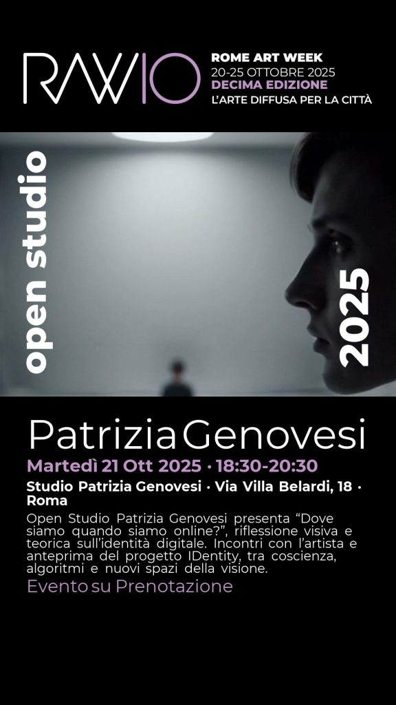 Dal 20 al 30 ottobre 2025 l’Open Studio Gallery di Roma ospita IDENTITY, la nuova mostra di Patrizia Genovesi, artista e regista poliedrica, da anni impegnata a intrecciare linguaggi visivi, scienza e filosofia. Il progetto è parte della programmazione ufficiale di Rome Art Week 2025 e si presenta come un percorso immersivo articolato in tre sezioni integrate, che indagano il tema dell’identità nell’epoca digitale a partire dall’identità che si forma nel territorio a contatto con le strutture del quotidiano fino al rapporto sempre più pervasivo con le intelligenze artificiali.