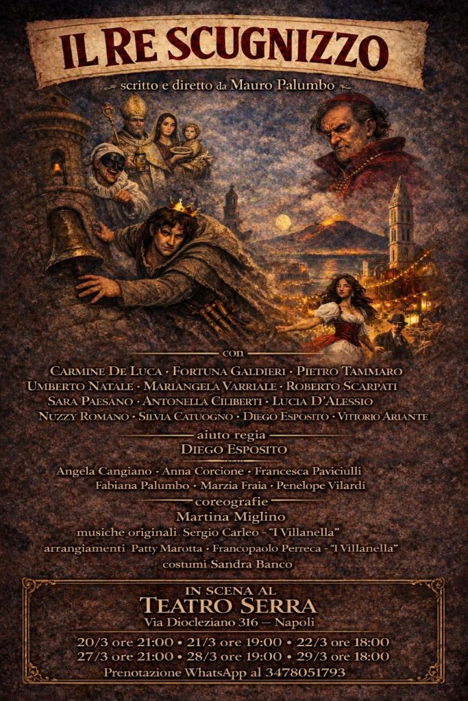 Una favola che ha ottenuto numerosi premi e riconoscimenti tra cui il Patrocinio Morale dell’Assessorato all’Educazione ed ai rapporti Interistituzionali del Comune di Napoli, per il suo Alto Valore Pedagogico e Istruttivo. È “Il Re scugnizzo” una rivisitazione del “Gobbo di Notredame” scritta e diretta da Mauro Palumbo che trasforma il capolavoro di Victor Hugo in una commedia musicale ambientata nella Napoli del XVIII secolo fatta di tradizioni, canti, povertà e orgogliosa dignità. In scena al Teatro Serra di Fuorigrotta, in Via Diocleziano 316, per due fine settimana consecutive, dal 20 al 22 e dal 27 al 29 marzo (venerdì ore 21:00, sabato ore 19:00, domenica ore 18:00) rappresenta il secondo appuntamento della stagione con gli allievi del Laboratorio, che coinvolge anche i ragazzi più giovani e gli attori professionisti della Scuola. Info: teatroserra@gmail.com, 347.8051793.
