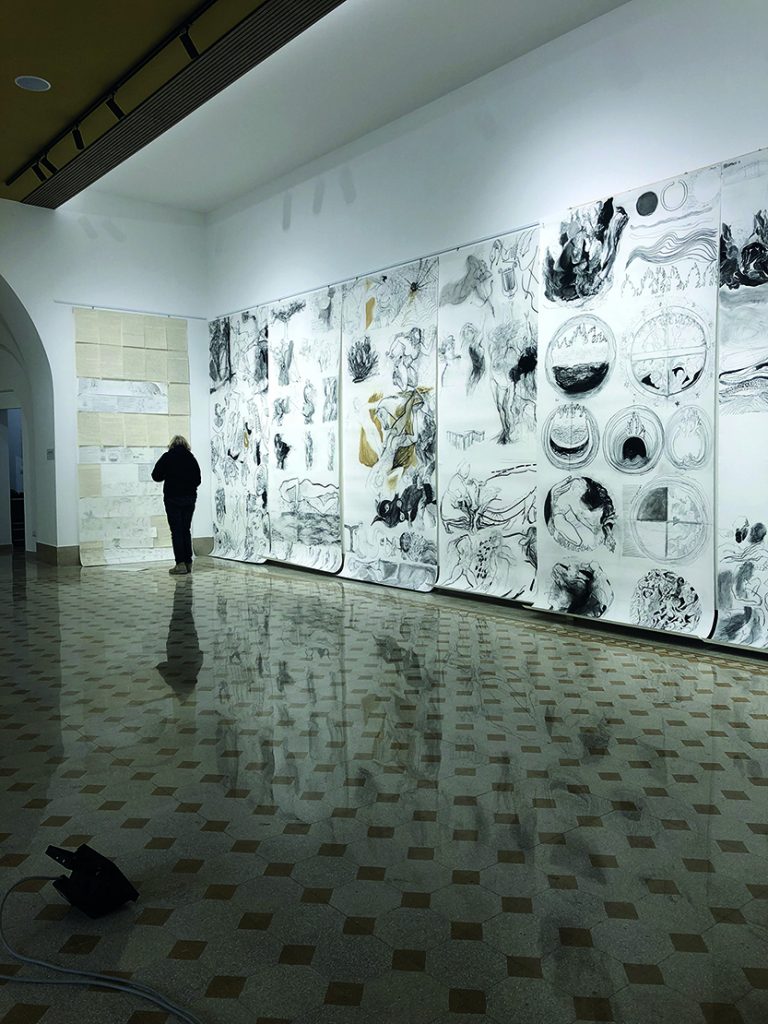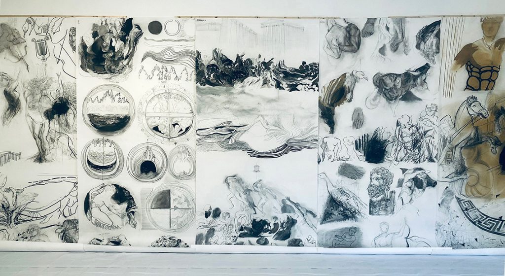 L’installazione che l’artista ha creato per l’occasione interpreta, attraverso la tecnica del disegno su carta, l’opera del poeta romano Ovidio, “Metamorfosi”, capolavoro letterario del mondo classico latino.