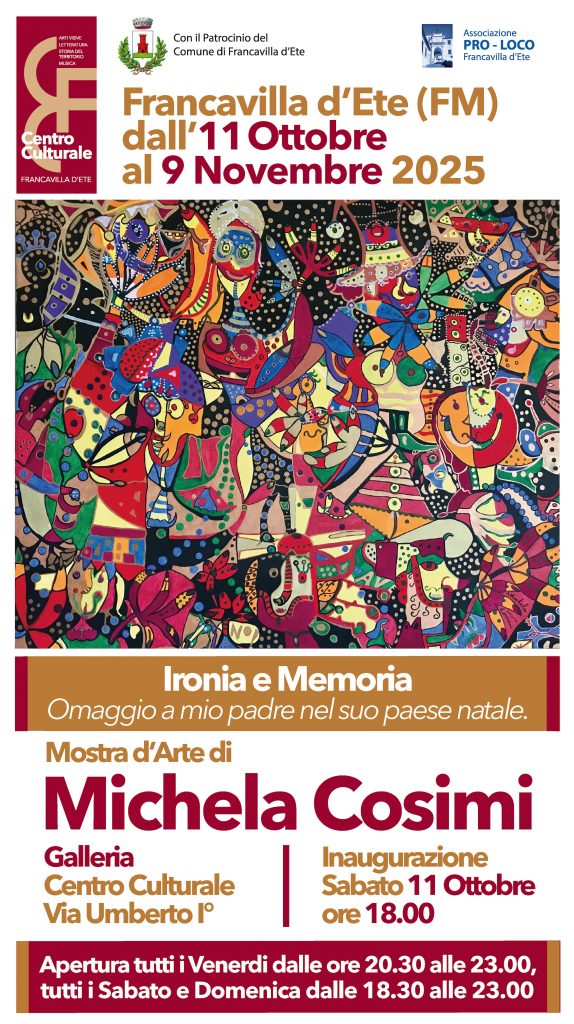 Francavilla d’Ete (FM) ospiterà dall’11 ottobre al 9 novembre 2025 la mostra d’arte "Ironia e Memoria", un omaggio molto personale della pittrice Michela Cosimi al padre, nel suo paese natale.