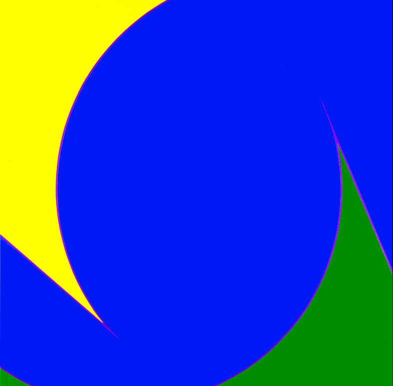 La ricerca di Madeddu assume la sezione aurea come principio generativo. La proporzione matematica, storicamente intesa come canone di bellezza statica e immutabile, viene reinterpretata come struttura dinamica e tradotta sulla tela attraverso la linea curva, che le conferisce direzione, tensione e movimento. Il colore non è elemento autonomo rispetto alla struttura geometrica: l'accostamento di complementari agisce insieme alla linea curva, attivando i campi proporzionali della sezione aurea e costruendo volumetrie e profondità percettive nella superficie piana.