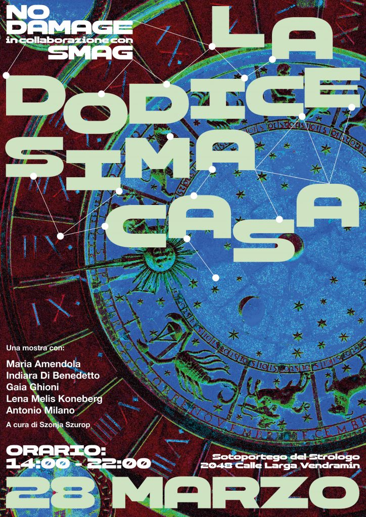 Fondato da Szonja Szurop e Chiara Christina Baumgärtel, il collettivo NO DAMAGE promuove una programmazione sperimentale volta a sostenere le pratiche artistiche emergenti attraverso interventi temporanei radicati nel tessuto sociale veneziano. Per questa occasione, il collettivo ha invitato gli artisti a confrontarsi con la memoria storica del luogo, segnata dalla presenza del Sotoportego del strologo. Secondo la tradizione locale, il toponimo rimanda agli astrologi che risiedevano nell'area in epoca medievale: figure che, grazie alle singolari dinamiche sociopolitiche della Serenissima, godevano di una libertà tale da poter esplorare non solo ambiti scientifici, ma anche pratiche occulte e alchemiche.