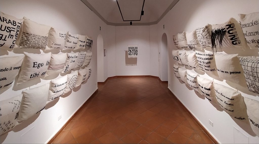 L'artista attraverso un operazione di tessitura e ricamo indaga il concetto di memoria e scrittura, in questo caso nella lingua madre, come parte fondamentale delle radici e dell’identità di una persona e patrimonio culturale intrecciato con l'intera umanità. L’artista indaga con l’annotazione e l’azione lenta del ricamo della parola sulla tela, il rapporto etimologico e fonetico del suono e dei vari significati che nel tempo creano quelle parole all’interno di stratificazioni linguistiche e di contaminazioni di vita tra diversi popoli e culture, per questo la mostra prende forma come una grande scatola del suono o del silenzio, in cui del silenzio, richiamando le sale di registrazione musicali ovattate che in questo caso sono di cuscini con scrittura da leggere, nel linguaggio verbale e tessile.