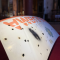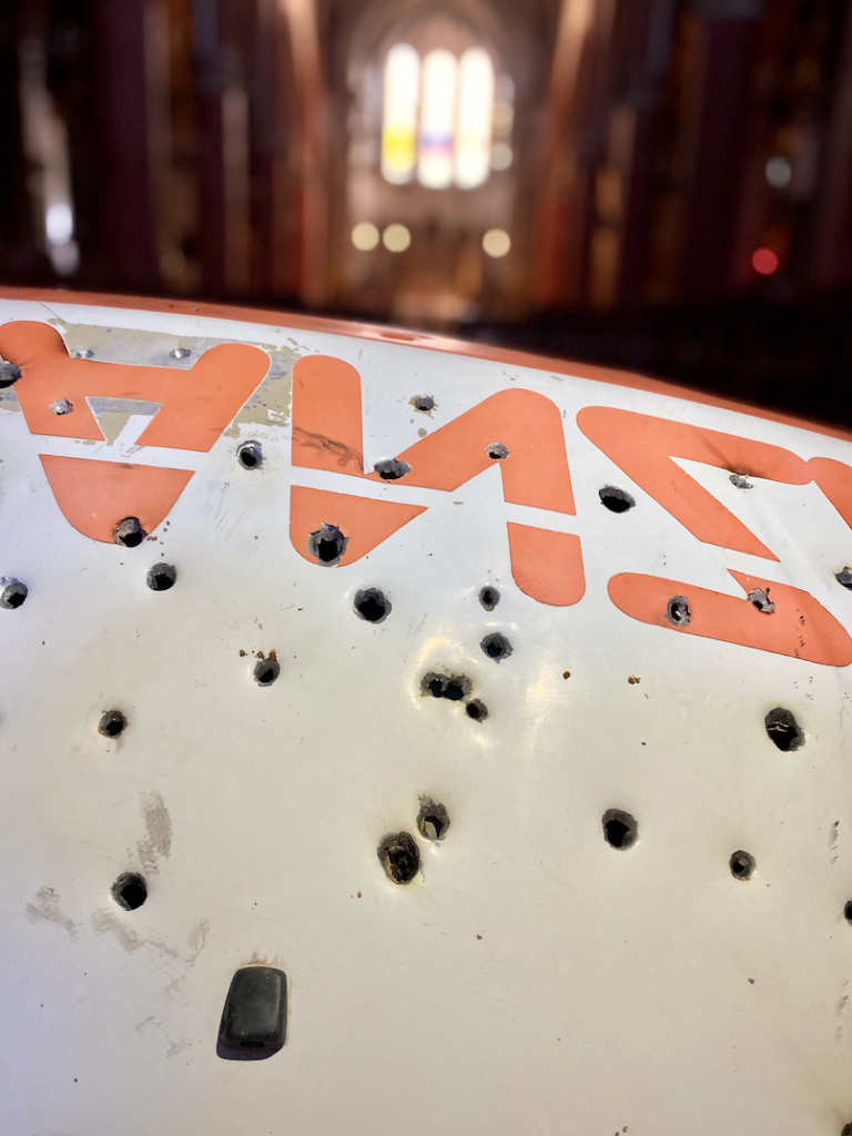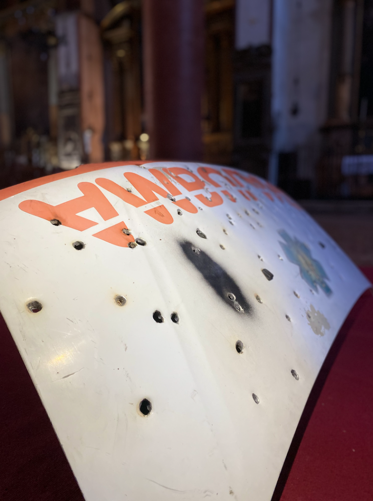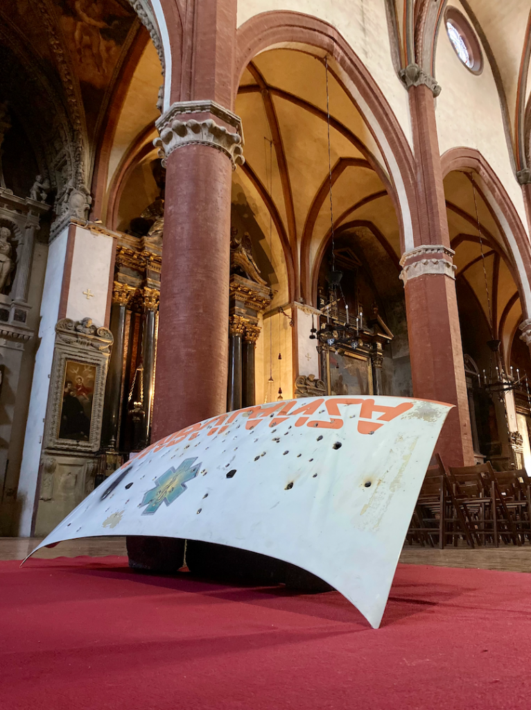 Il testo descrive l’installazione Shooting at the Red Cross di Marco Mazzarello, presentata ad ArteFiera nella Basilica di Santa Maria dei Servi a Bologna. L’opera, un cofano di ambulanza capovolto e crivellato da colpi, inserito in uno spazio sacro, mette in discussione i simboli universali di protezione e soccorso, evidenziandone la fragilità. Attraverso un forte dialogo tra sacro e contemporaneo, l’installazione genera una tensione tra ironia e dolore e invita lo spettatore a riflettere su vulnerabilità, potere e perdita di sicurezza nella società contemporanea.