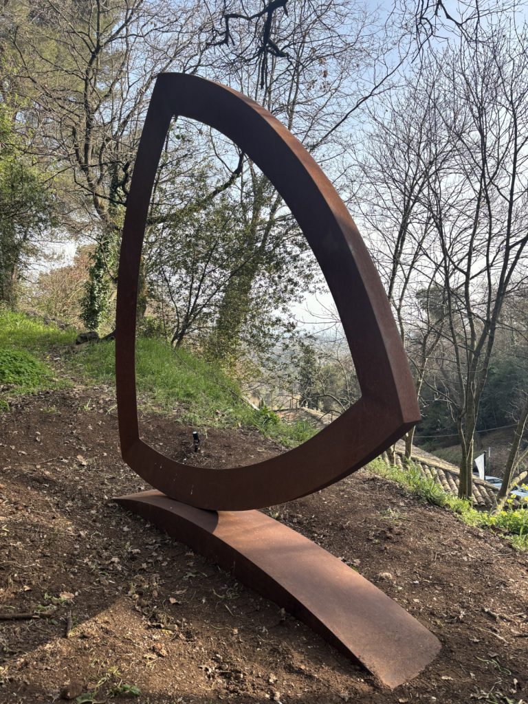 La scelta di posizionare l’opera nella sommità del parco, a ideale convergenza delle fughe prospettiche che giungono dal basso, sollecita la tensione dello sguardo verso l’alto, favorendo il valore della convivenza tra forma e paesaggio, tra volume e spazio, tra la firmitas dell’opera e la sua dinamica apertura verso il mutevole e l’impermanente. Nella concezione imperfetta, asimmetrica e sbilanciata dell’elemento geometrico la scultura sfida l’equilibrio e la staticità, sposta il suo baricentro, contempla impercettibili variazioni illusionistiche della forma, rinunciando a ogni presunta e matematica oggettività. Un’intenzione che privilegia il paradosso alla razionalità, la deformazione alla certezza: “Preferisco il desiderio della sospensione come stato di creatività, il desiderio di governare l’insicurezza dell’ideazione.”