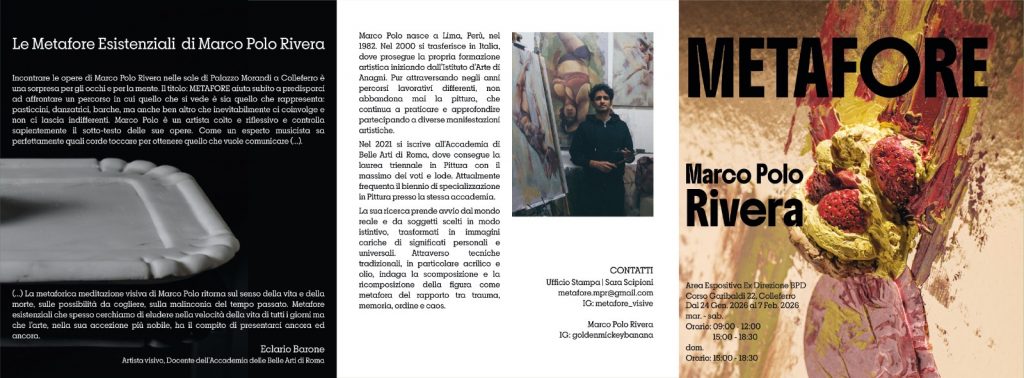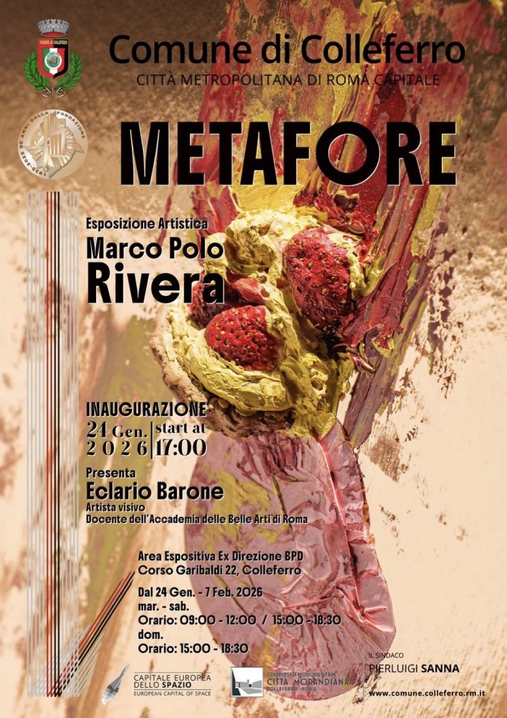Dal 24 gennaio al 7 febbraio 2026, l'Area Espositiva Ex Direzione BPD di Colleferro ospita la personale di Marco Polo Rivera. La mostra traccia un percorso tra ordine e caos, evolvendo dalla bidimensionalità della pittura alla monumentalità della scultura. Tre i pilastri narrativi indagati dall'artista: Crumbs, una riflessione sull’effimero e le relazioni interpersonali; Pole Mythos, che eleva la figura femminile a icona di resistenza; e Iter Animae, dove l'archetipo della barca simboleggia il viaggio esistenziale. Un’indagine che trasforma il reale in "attrattori simbolici" capaci di toccare corde universali.