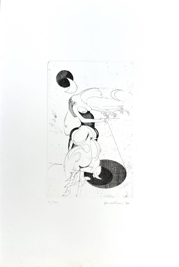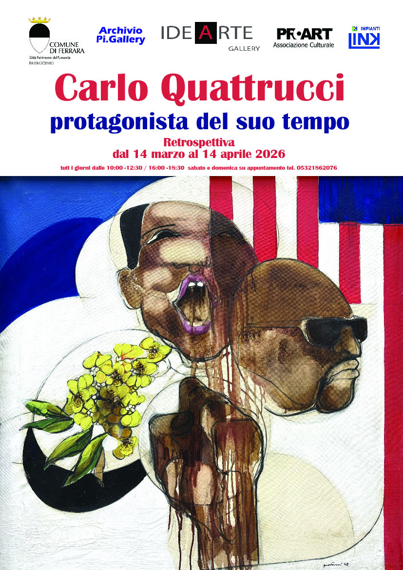 Carlo Quattrucci espose a Ferrara nel marzo del lontano 1969. Fu Franco Farina, allora direttore del Palazzo dei Diamanti, ad ospitare l’artista romano con una mostra personale intitolata Black-Power presso il Centro Attività Visive. L’evento, presentato dal critico Dario Micacchi, testimoniava l’impegno dell’artista verso temi sociali di rilevanza globale. L’arte di Quattrucci era spesso caratterizzata da una forte carica civile e sociale, nella mostra di Ferrara, infatti, si presentò con una pittura figurativa densa di significati politici e umani, in cui seppe raccontare le tensioni dell’epoca con uno stile incisivo e graffiante.
