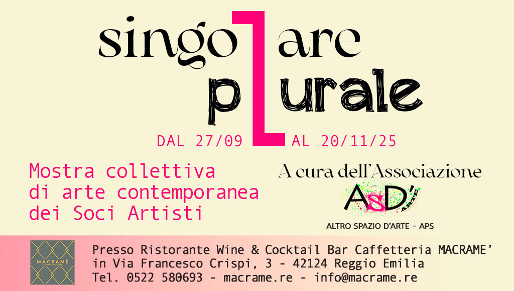 Presso il locale “Macramè”, inaugura “Singolare plurale”, la mostra collettiva che riunisce i soci artisti per l’anno 2025 dell’associazione Altro Spazio D’arte, organizzatrice dell’evento.