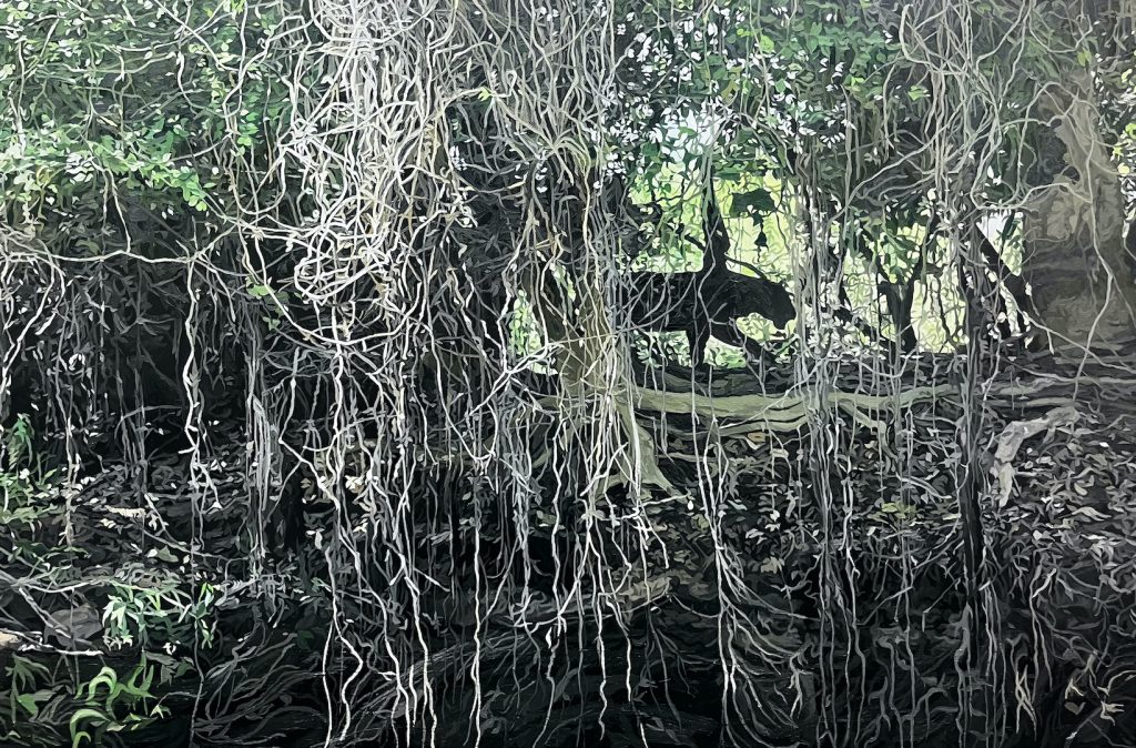La mostra di Luca Padroni si inserisce nel ciclo di mostre ideato da Fabio Sargentini (in corso già da qualche anno) che il gallerista chiama “Arte da teatro”. Sul palcoscenico del teatro della galleria Padroni posizionerà infatti una tela di grandi dimensioni con uno stagno al quale si abbevera un coccodrillo reale (!). Mentre nella sala adiacente l’artista disegnerà direttamente sulle pareti una foresta abitata da un elefante.
