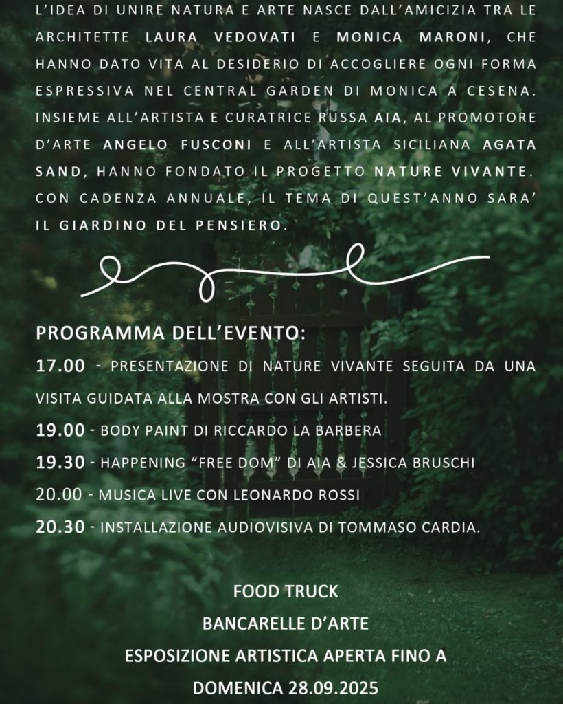 Al Central Garden di Cesena va in scena “Nature Vivante”, mostra immersiva tra arte e natura in programma sabato 28 e domenica 29 settembre. Il tema scelto è “Il giardino del pensiero”, un percorso tra installazioni, performance e musica dal vivo con la partecipazione di 14 artisti italiani e internazionali. Il progetto è ideato da Monica Maroni, Agata Sand, Laura Vedovati con la curatela di Aia. L’iniziativa è sostenuta da Officina dell’Arte di Angelo Fusconi. Ingresso gratuito.