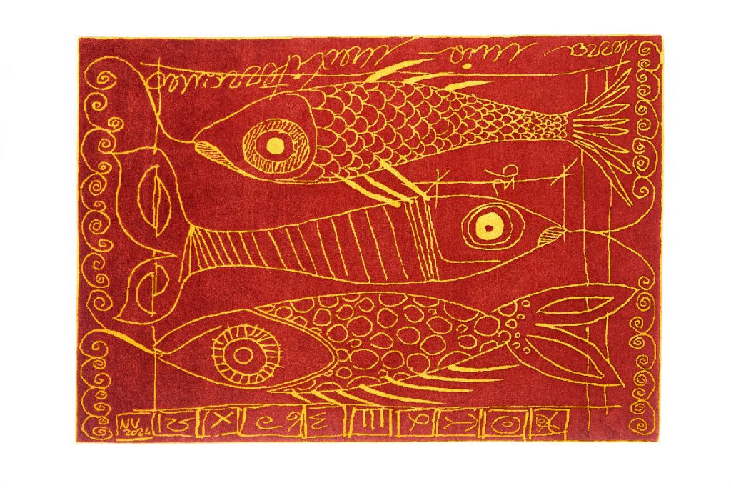 In esposizione i nuovi tappeti tibetani annodati a mano, accanto a sculture iconiche come Afrodite (2005), Derviscio (2011) e Maialino da parata (2021). Non mancano lavori evocativi come il candelabro Anime – Pesci (2005) e la scultura in acciaio Ekunus Ekuna (2017).