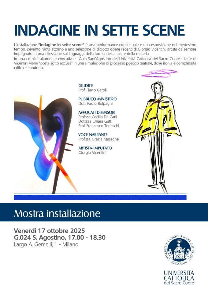 Giorgio Vicentini, adagia sui banchi della bellissima l’Aula Sant’Agostino dell’Università Cattolica del Sacro Cuore di Milano, diciotto sue opere recenti…