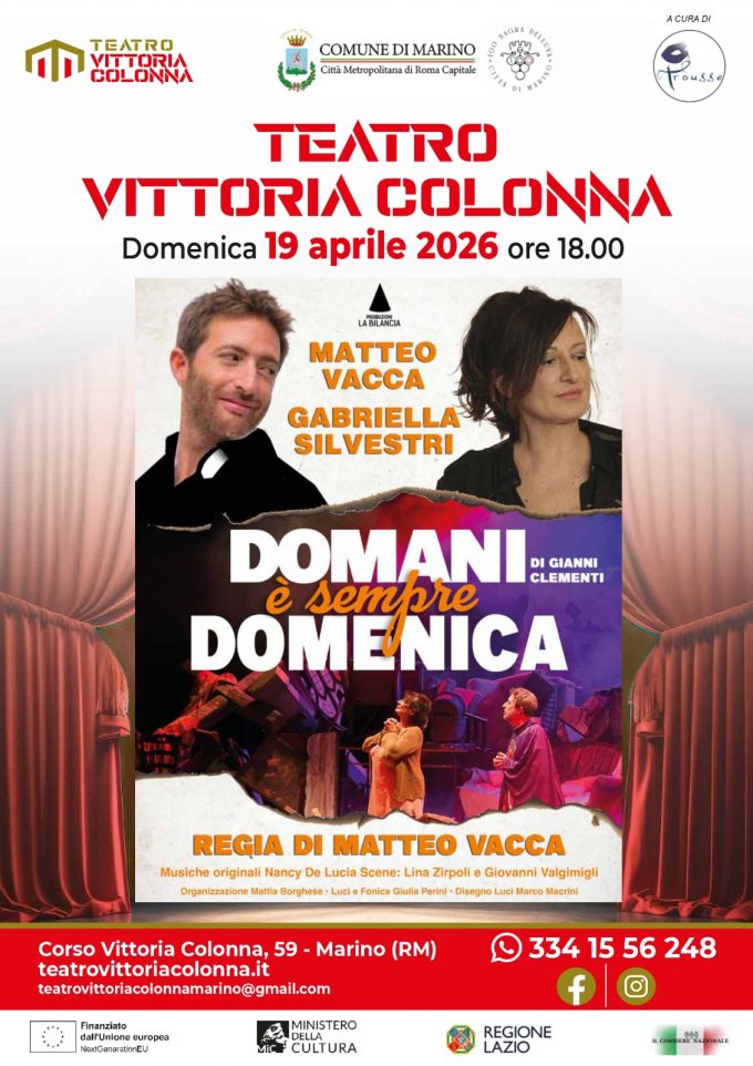 Domenica 19 aprile 2026 alle ore 18,00 andrà in scena presso il Teatro V. Colonna di Marino la commedia “Domani…