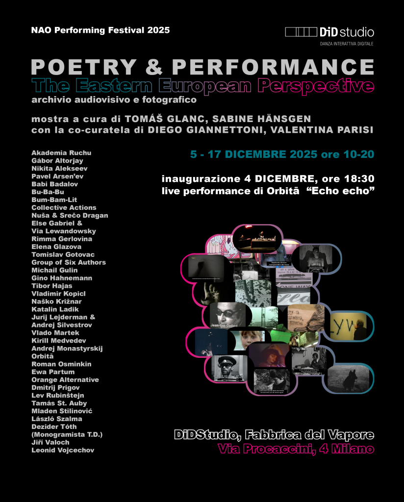 Poetry & Performance - The Eastern European Perspective è un'esposizione di materiale d’archivio audiovisivo e fotografico che fa incontrare l'arte performativa con l'espressione poetica focalizzata sull'area est-europea dagli anni '60 del secolo scorso fino ai nostri giorni.