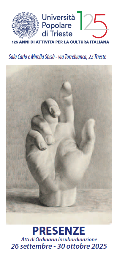 Con la mostra “Presenze – Atti di Ordinaria Insubordinazione” l’Università Popolare di Trieste espone, alla Sala Carlo e Mirella Sbisà (via Torrebianca 2), cinquanta opere di artiste e artisti formatisi proprio in seno dell’Ente, sotto l’esperta guida di Francesca Martinelli, docente e curatrice della mostra, che si inaugura venerdì 26 settembre alle ore 18.00, alla presenza del Presidente Edvino Jerian, del Vice Presidente Paolo Rovis, e del Segretario Generale Fabrizio Somma.