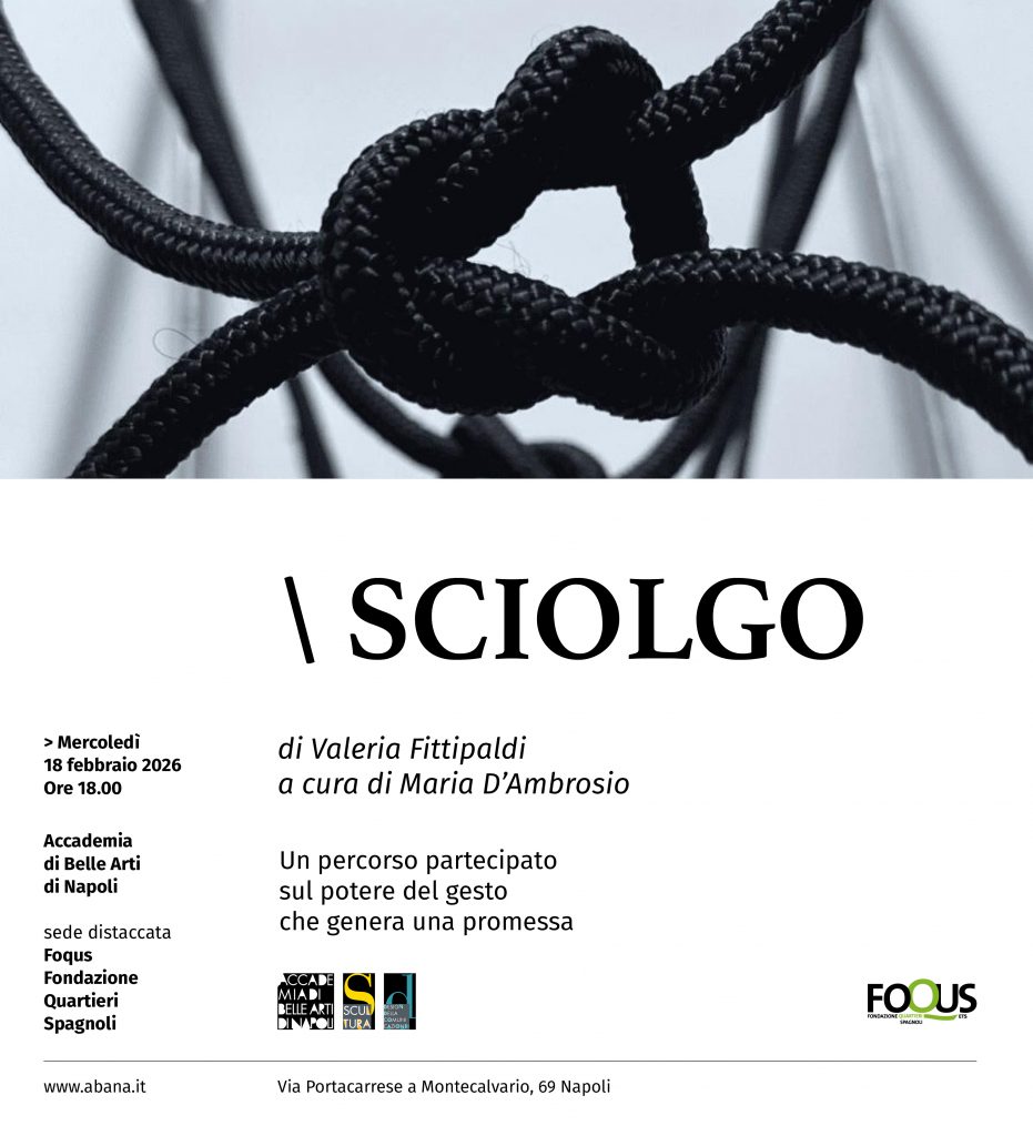 Tutte e tutti invitati. Un’istallazione monumentale, un corridoio lungo 9 metri il cui attraversamento è ostacolato da 100 corde chiuse con un nodo. I fruitori verranno invitati a interagire con l’opera sciogliendo uno o più nodi. Ciascuno può sperimentare il compimento di una promessa e l’attivazione di una intenzione personale che la performance pubblica apre alla sua valenza sociale e simbolica. al primo appuntamento il 18 febbraio 2026 alle ore 18,00, per testimoniare un sostegno alle donne in chiave anti-sessista. Un invito al pubblico a compiere un’azione concreta e fortemente simbolica per farsi artefici di una trasformazione condivisa che richiama la collettività a farsi parte attiva nel contrastare la violenza di genere. L’opera è dunque un dispositivo pedagogico che si propone di sensibilizzare le comunità e i diversi gruppi che incontrerà su questioni emergenti come l’uso e il significato delle parole e del loro possibile contenuto violento, discriminatorio e sessista. L’installazione ‘Sciolgo’ è parte del lavoro di tesi guidato da Rosaria Iazzetta docente e coordinatrice della Scuola di Scultura dell’Accademia di Belle Arti di Napoli. Ospitato dalla Fondazione Foqus ai Quartieri Spagnoli di Napoli e grazie alla collaborazione della Scuola di Scultura e della Scuola di Design della Comunicazione dell’Accademia di Belle Arti di Napoli.