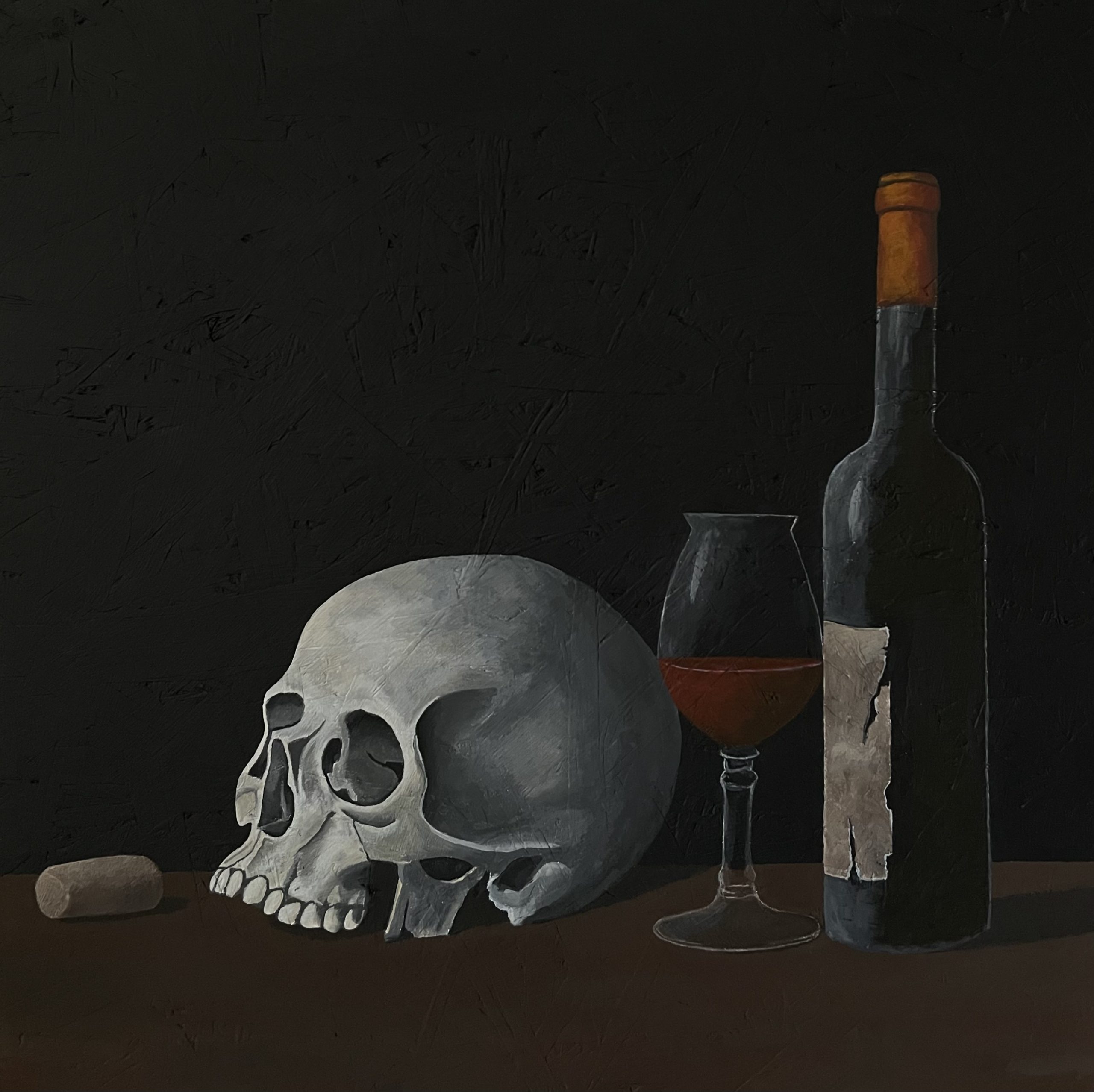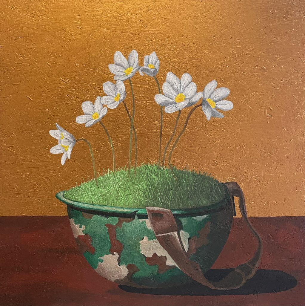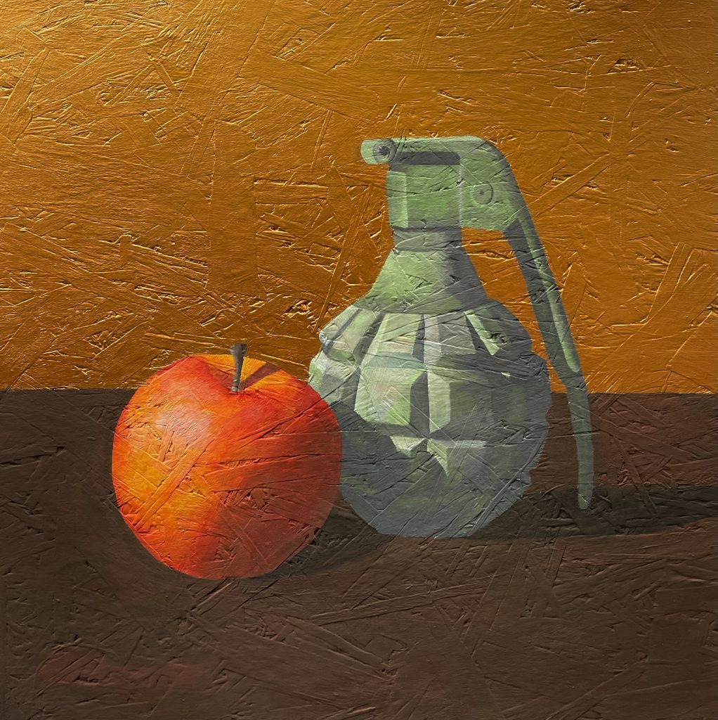 Le opere rielaborano il genere della natura morta attraverso elementi iconografici tradizionali, frutta, oggetti quotidiani, accostati a simboli che introducono riferimenti contemporanei: elmetti trasformati in vasi, teschi, granate. Il tema della vanitas riemerge così in dialogo con l’immaginario visivo attuale, tra citazione e ridefinizione.