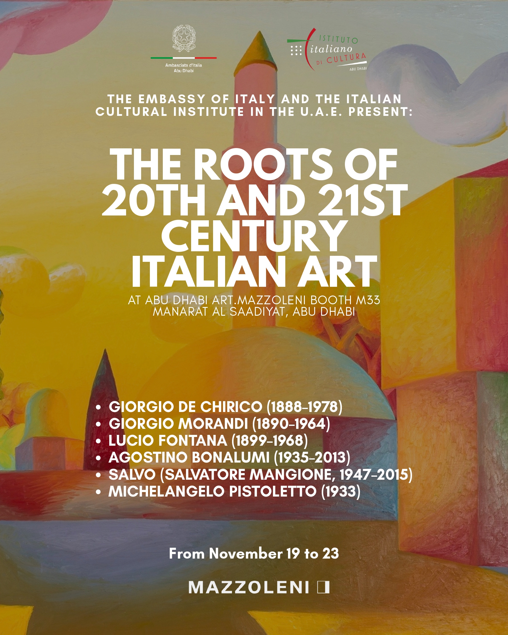 L’Istituto Italiano di Cultura di Abu Dhabi, l’Ambasciata d’Italia ad Abu Dhabi, in collaborazione con la Galleria Mazzoleni, sono lieti di presentare il progetto espositivo, “The Roots of the 20th and 21st Century Italian Art”. L’evento di presentazione e il tour guidato della mostra si terra’ il 19 novembre alle ore 18:00 presso il booth M33. Per partecipare, si prega di inviare una mail a abudhabiiic.segre@esteri.it. I posti sosti limitati.