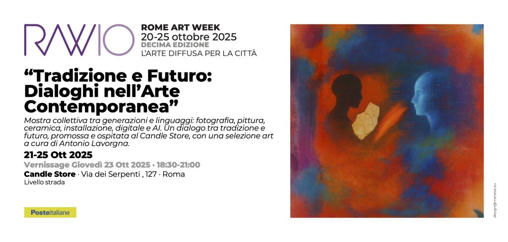 In occasione della Rome Art Week 2025, mostra collettiva tra generazioni e linguaggi: fotografia, pittura, ceramica, installazione, digitale e AI. Un dialogo tra tradizione e futuro, promossa e ospitata al Candle Store, con una selezione art a cura di Antonio Lavorgna.