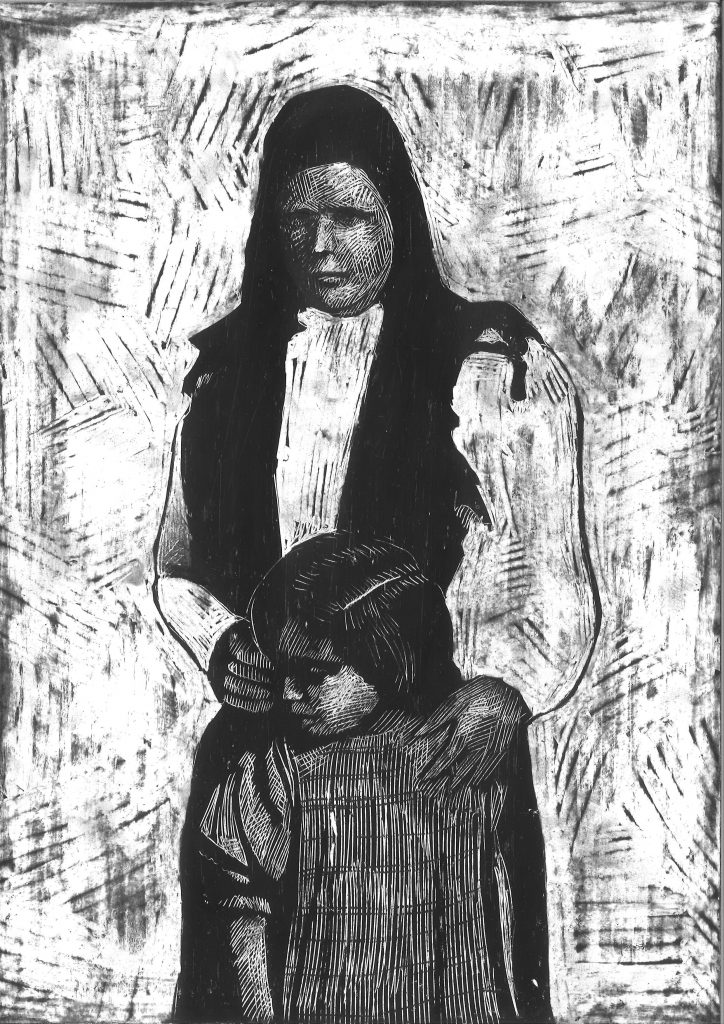 Le figure contadine, ricorrenti nella sua iconografia, diventano depositarie di memoria e identità. Il tratto scuro e profondo – simile alla grafite o al carbone – è al tempo stesso fluido e ruvido, capace di espandersi, deformarsi e rigenerarsi. Le narrazioni visive si collocano in un tempo che richiama il Novecento, insieme storico e simbolico, attraversato da valori come il lavoro manuale, il rapporto con la terra, il passaggio tra generazioni e la resistenza.