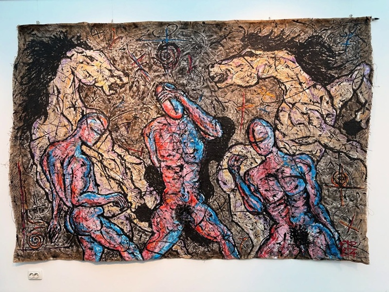 Spicca per monumentalità e per impatto visivo il trittico di Francesco Patanè di ben 12 metri quadrati (600x200) “Body and Mind in motion”, realizzato con il suo personalissimo stile e con la sua tecnica unica che mescola asfalto e acrilico su juta.